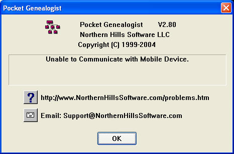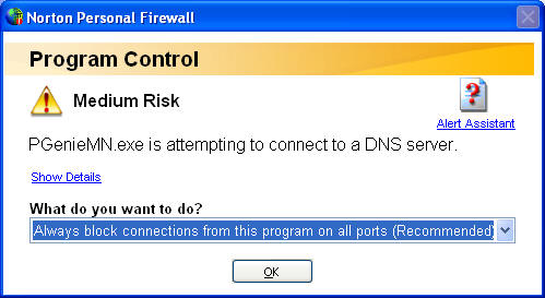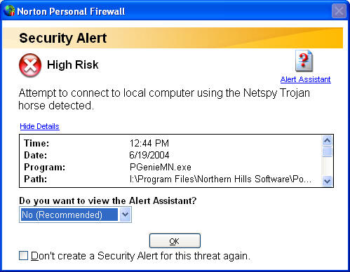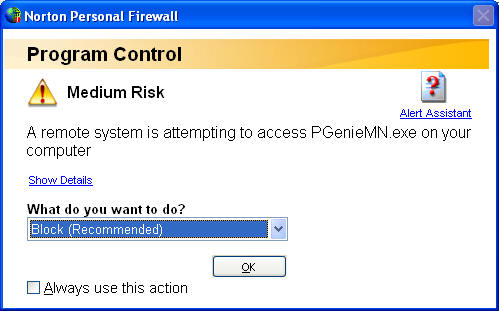 If you are getting the previous screen, then the firewall is blocking access from the device to the desktop. You most likely saw the following screen during your first synchronization. Pocket Genealogist is trying to determine the TCP/IP address of your desktop computer in order to start the synchronization process. If you select the default action of "Always block connections from this program on all ports (Recommended)", then you will get the "Unable to Communicate" screen. (Click HERE to learn how to undo making this selection) You should select "Always allow connections from this program on all ports" or "Manually configure internet access" and make a specific rule. Note: Pocket Genealogist does not connect to the internet, this is "generic" wording by the firewall program. You may also get the following alert if you are using the default port of 1024 and you have "Intrusion Detection" turned on. This is one of the "limitations" of firewall programs. They have to make assumptions about programs based on ports being used. Pocket Genealogist does not contain the "Netspy Trojan horse". (If you go to the Alert Assistant, it even acknowledges that it MAY be the Netspy Trojan horse although the above screen seems to indicate a certainty that it is the Trojan horse) I recommend changing the port used by Pocket Genealogist. (Version 2.81 uses port 1500 by default) Click HERE to see how to change the port used by Pocket Genealogist. Note: The Pocket Genealogist synchronization program on the device may be running and "hung" if a connection is blocked. You will need to do a "Soft Reset" on your device in order to close that process. See your user guide for your device on how to do a "Soft Reset". Note: I would recommend turning off "AutoBlock" in the "Intrusion Protection" configuration until you get synchronization working. Even then, if you turn it back on, make sure you change the port used by Pocket Genealogist so that it's not using 1024 or it will trap it as a "Trojan". Once you get past the trojan warning and have set access as "Permit All", you should still get the following. You should select "Permit" to allow the connection. If you never want to see this prompt again during a Pocket Genealogist synchronization attempt, also check the "Always use this action". If you already selected "Block", you'll need to remove all references to "PGenieMN.exe" from the firewall so you will be prompted again. Click HERE to see how to do this. Final NotesI found Norton Personal Firewall 2004 to be confusing to use and very inconsistent UNTIL I changed the port used by Pocket Genealogist to 1500. (or any value that isn't flagged as being a port used by a Trojan - you can search the internet for "known trojan ports" and will get a REALLY long list) If you have problems getting the above to work, I would change the Pocket Genealogist port, then remove all references to PgenieMN.exe in the Personal Firewall configuration, turn off "Autoblock" in the "Intrusion Detection" configuration, then try the sync again. (if you see any sync windows on the device, do a "soft reset") You should then get the following screens when you try the synchronization: You should select "Always allow connections from this program on all ports". After pressing "OK", the following should appear: You should select "Permit" and check "Always use this action". Once I did that, I never got another Norton prompt about synchronization even after I turned "AutoBlock" back on.