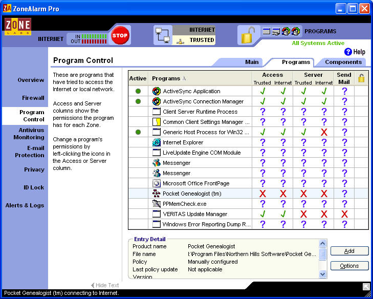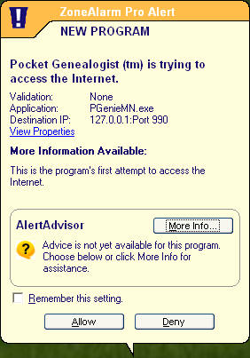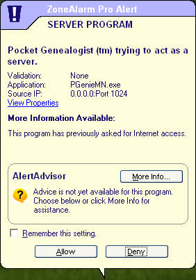 You also need to set "ActiveSync Application" and "ActiveSync Connection Manger" to allow access. Click on the ? or X for each column for those entries and set them to "Allow". (The above example already shows them set in this manner) Now, when you do the synchronization again with Pocket Genealogist, you will get the following: The above occurs when Pocket Genealogist attempts to determine the TCP/IP address for the desktop. Note: Pocket Genealogist does not connect to the internet, this is "generic" wording by the firewall program. Check the "Remember this setting" and select "Allow". You will then get the following: At this point Pocket Genealogist is trying to communicate from the device to the desktop. Check the "Remember this setting" and select "Allow". You now should be able to do synchronizations. Note: Unlike previous versions of ZoneAlarm, you CAN set the Pocket Genealogist settings to "Ask". (The question mark) If you don't use the "Remember this setting" checkbox, the configuration will be setup in this manner. You must then select "Allow" for both of the above prompts every time you do a synchronization.
