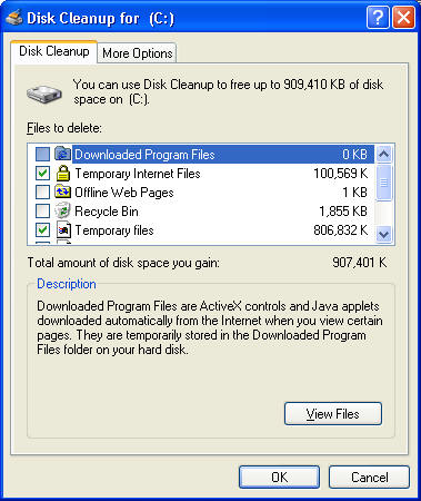 9. Pick the items you want to cleanup, the one applicable to this situation is "Temporary Files". Press OK, when ready to perform the cleanup.